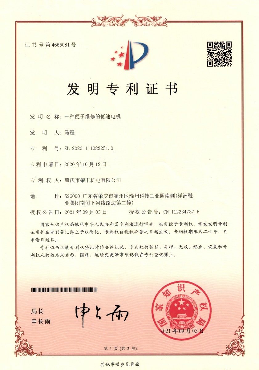 发明专利证书--一种便于维修的低速电机