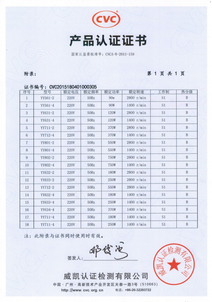 CVC产品认证证书-YY系列单相电容运转异步动机