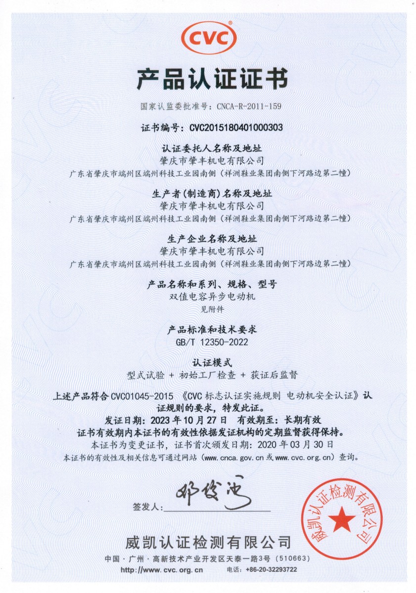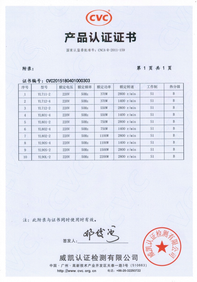 CVC产品认证证书-YL系列双值电容异步电动机